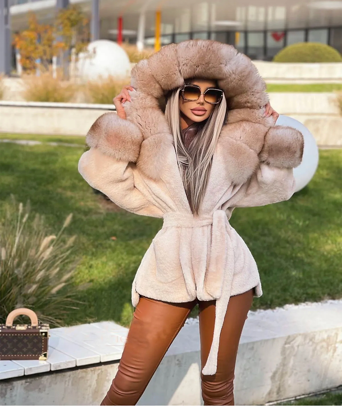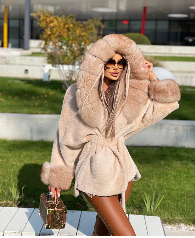 Arctic Veil – beżowy płaszcz z tkaniny alcantara z kapturem i mankietami wykończonymi futrem z lisa