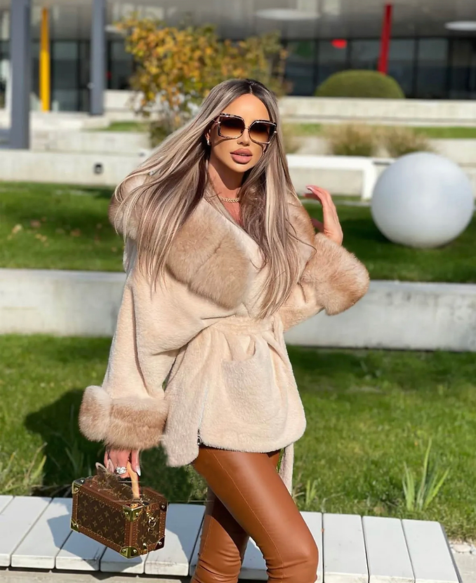 Arctic Veil to wyjątkowy beżowy płaszcz wykonany z miękkiej i aksamitnej w dotyku tkaniny typu alcantara. Jego klasyczna forma została wzbogacona o obszerny kaptur oraz mankiety wykończone naturalnym futrem z lisa, co nadaje całości ekskluzywnego charakteru. Długość sięgająca do połowy uda subtelnie podkreśla sylwetkę, zapewniając jednocześnie komfort i ochronę przed chłodem. Model idealny na zimowe dni – zarówno do eleganckich, jak i codziennych stylizacji. Elegancja, ciepło i luksus w jednym.