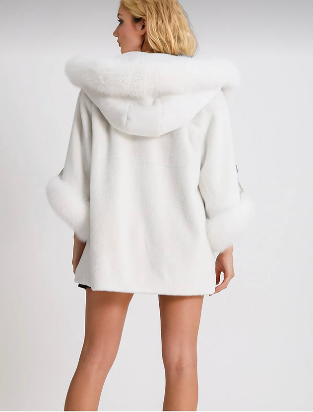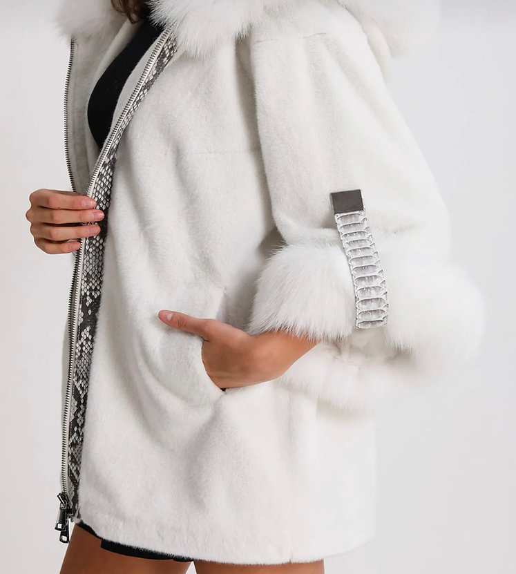 Ice Empress – płaszcz z białej alcantary z futrem z lisa i wykończeniem w motyw pytona