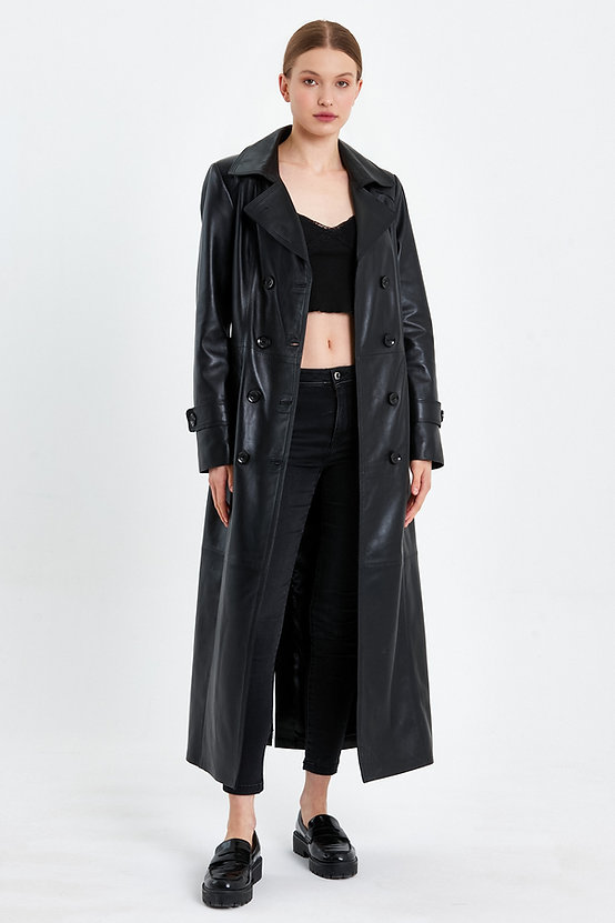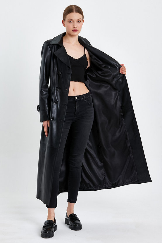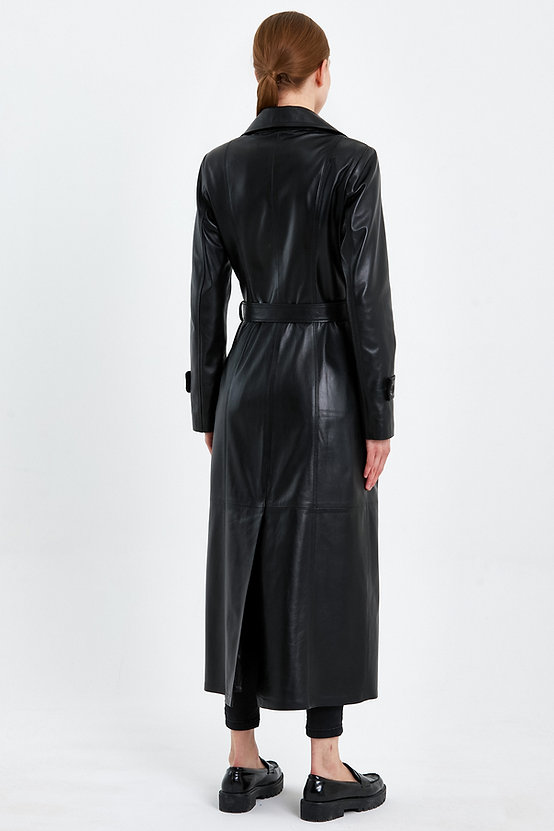 Shadow Mantle – damski czarny płaszcz z jagnięcej skóry z zapięciem dwurzędowym