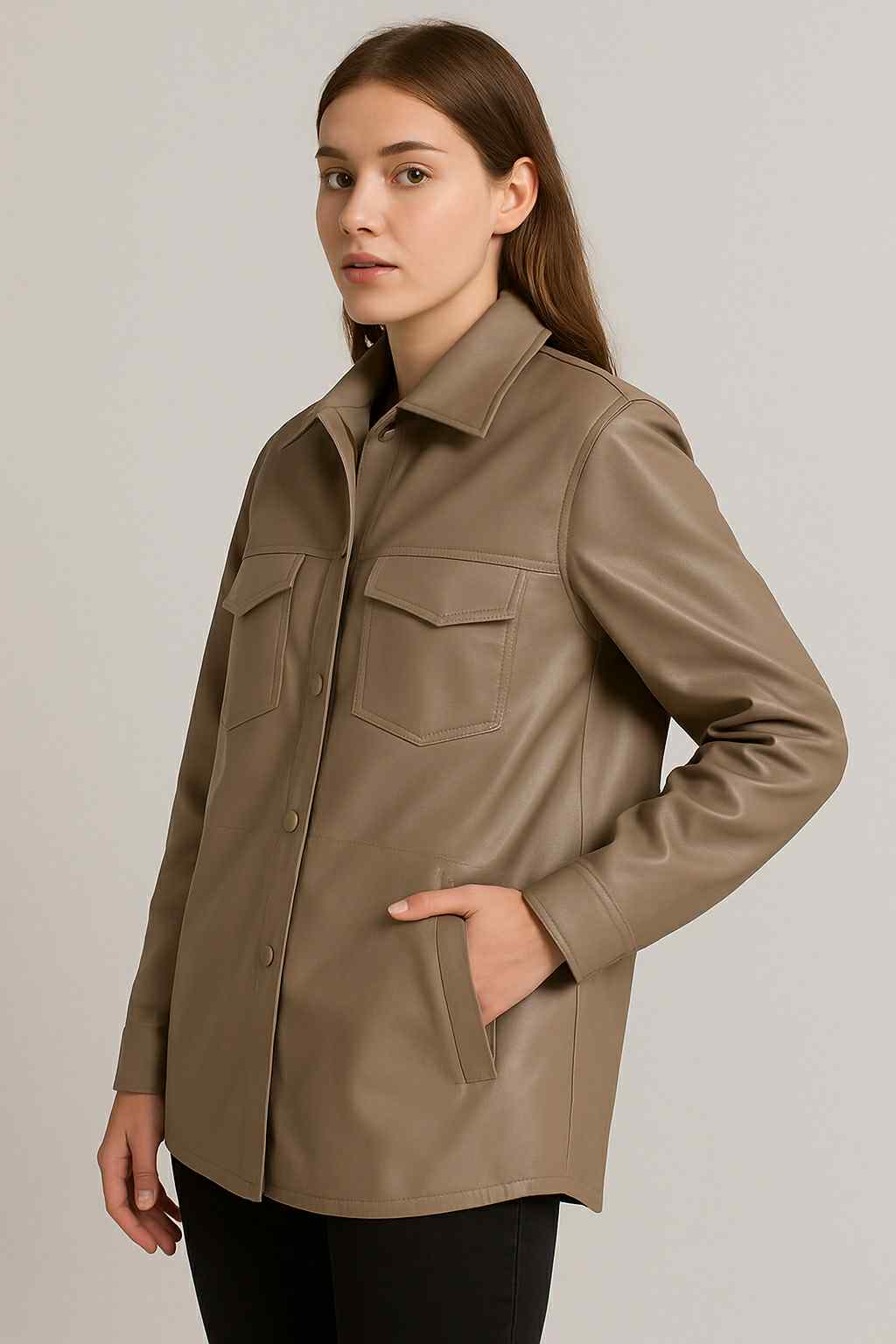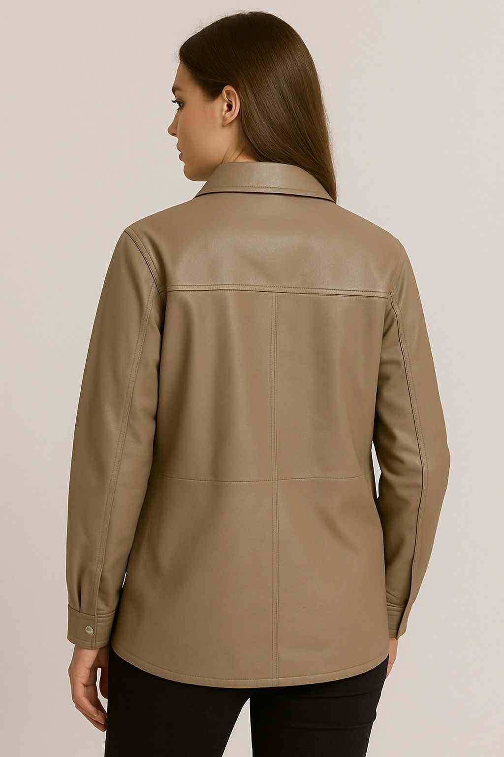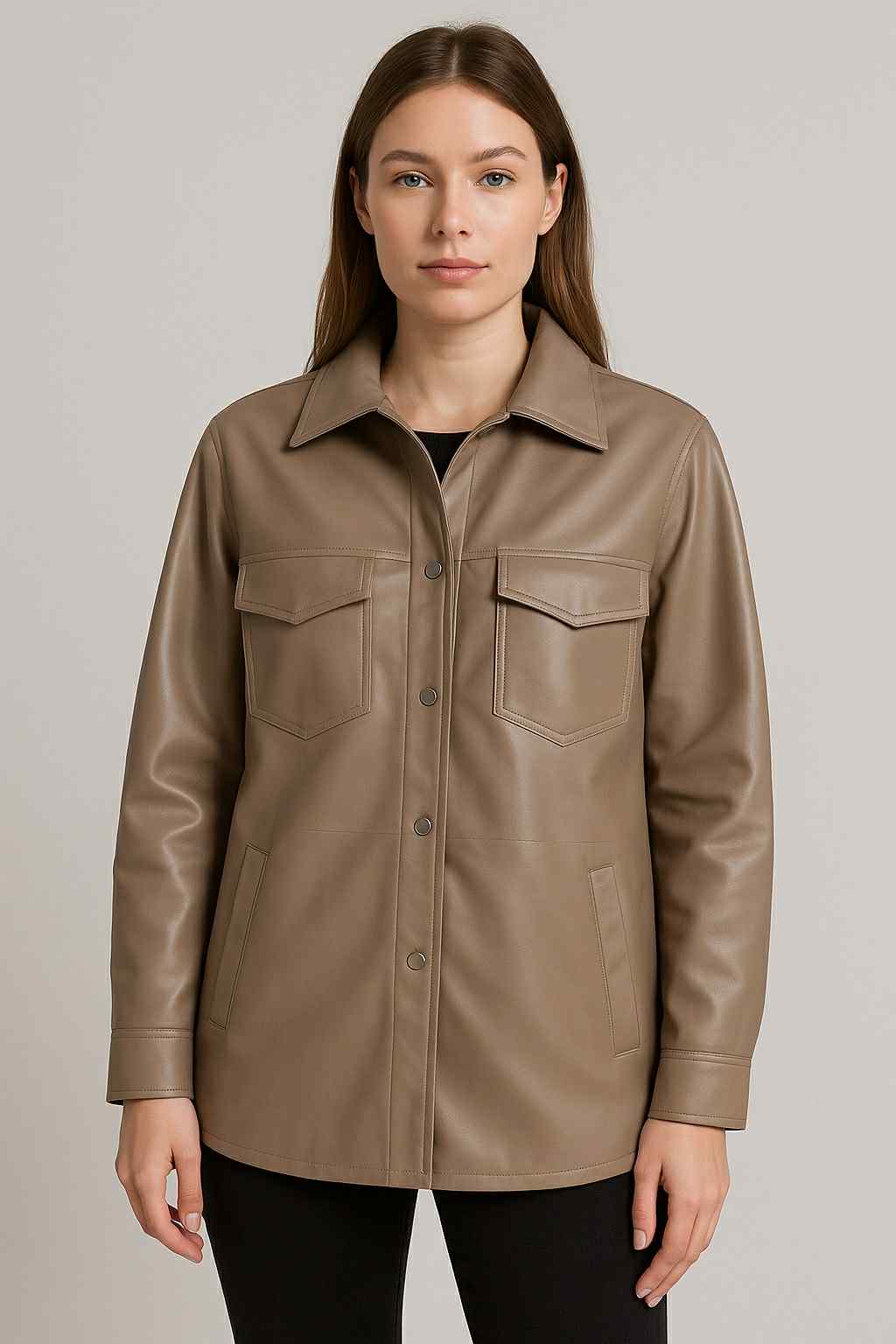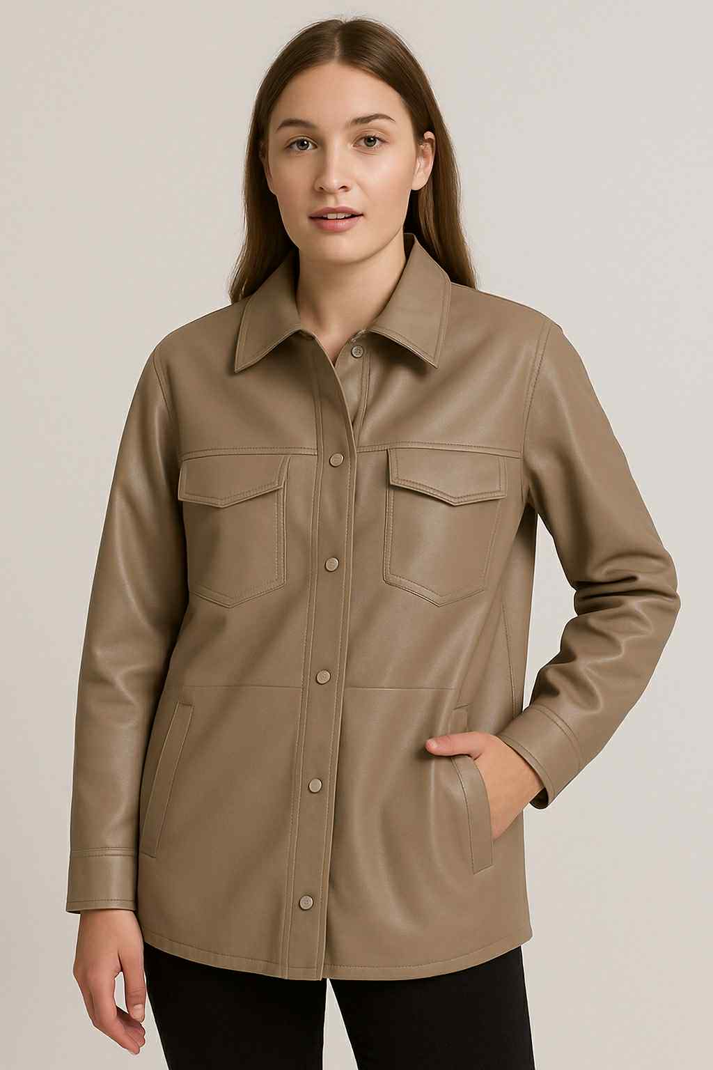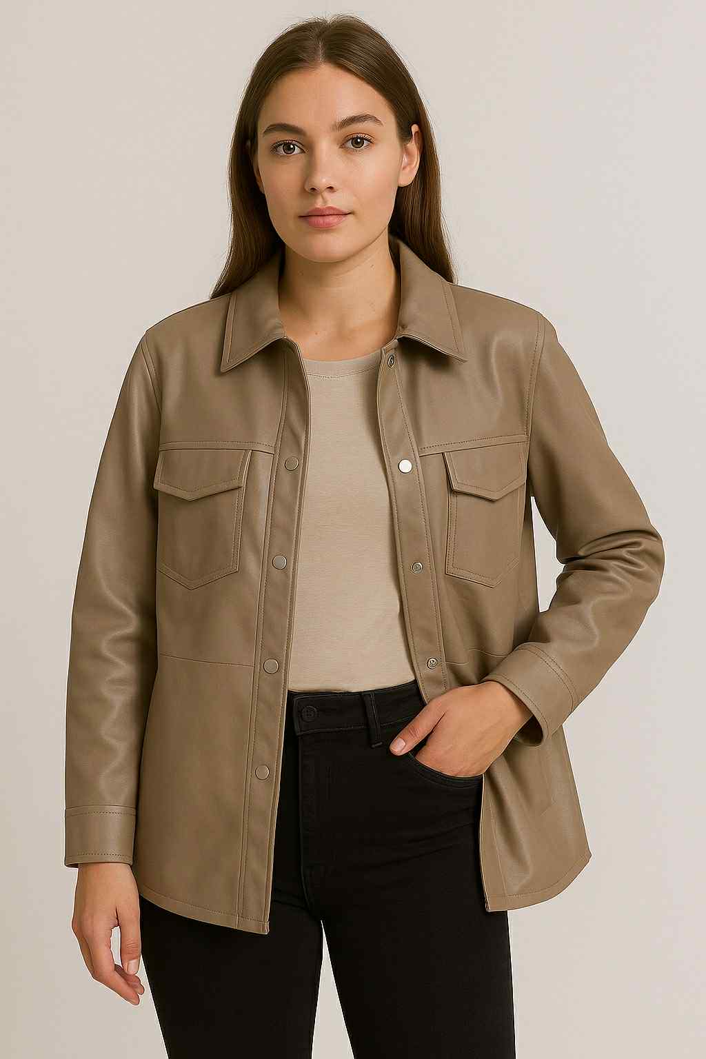 Model inspirowany krojem koszulowym łączy w sobie minimalistyczną elegancję i funkcjonalność. Gładka, miękka w dotyku skóra naturalna pięknie układa się na sylwetce i nabiera charakteru z każdym założeniem. Zapięcie na zatrzaski i klasyczny kołnierz dodają całości nowoczesnego sznytu, a praktyczne kieszenie zapewniają wygodę na co dzień.