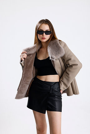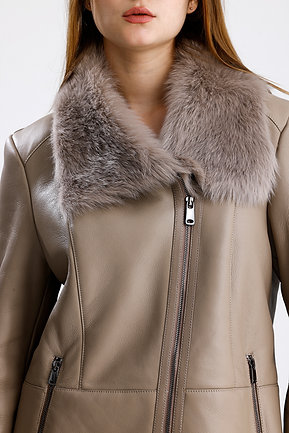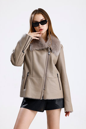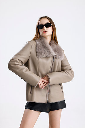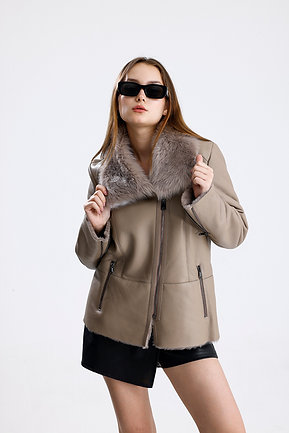 Szara damska kurtka z kożuchem – Kołnierz z długowłosej skóry jagnięcej Toscana